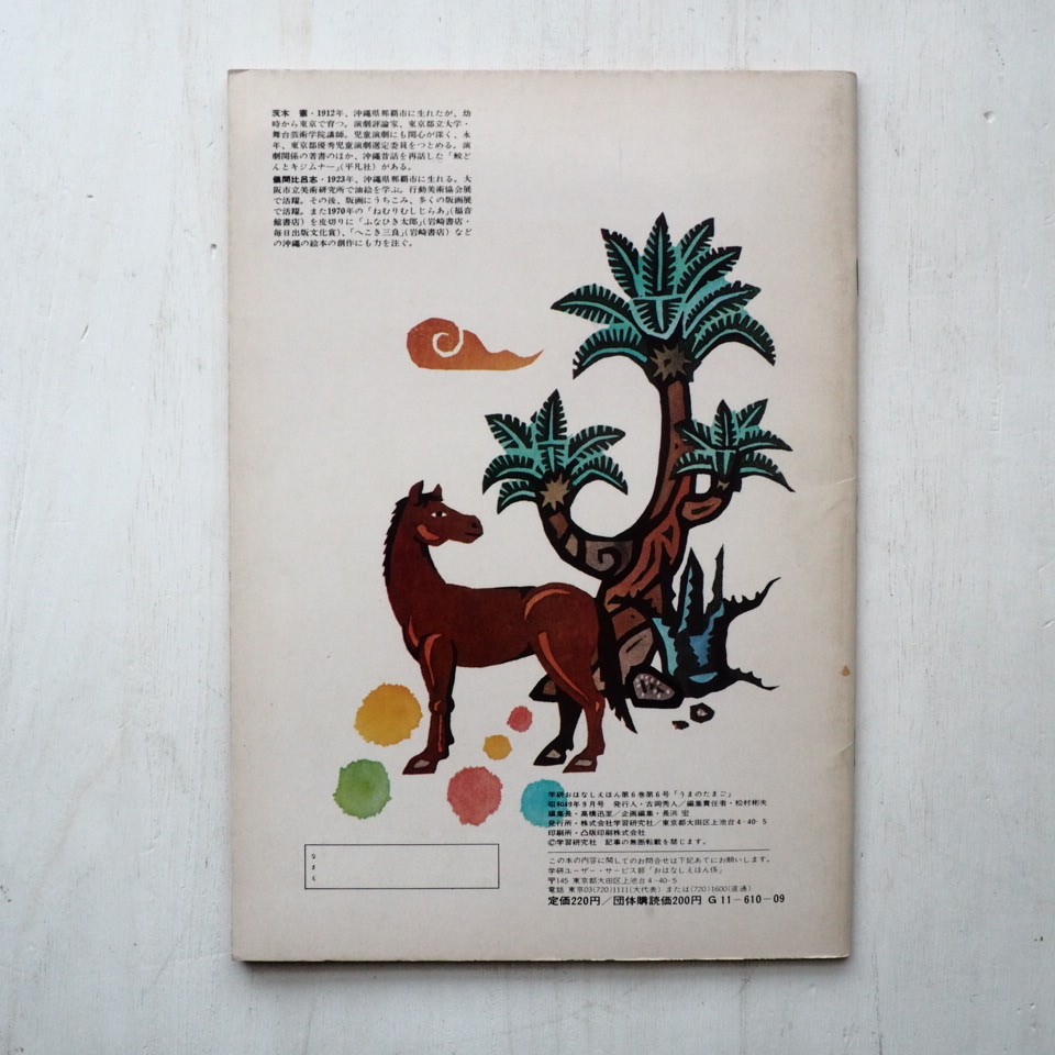 沖縄民話/茨木憲/儀間比呂志「うまのたまご」*学研おはなしえほん [07483] 沖縄民話/茨木憲/儀間比呂志「うまのたまご」*学研おはなしえほん [07483] 販売価格: 1,000円(税込) Tweet お問い合わせ 著者 : 茨木憲(文) 儀間比呂志(訳) 沖縄民話出版社 : 学習研究社発行年 : 1974/9/1 初版本の寸法 : 28.5 x 20.8 x 0.3 cm 送料区分 : A本の状態 : A〜B■絶版(版元品切れ、重版未定)です。■学研おはなしえほん・ソフトカバーです。■表紙の薄いスレ/薄いヤケあり。 詳細画像 こちらもおすすめです 儀間比呂志「りゅうになりそこねたはぶ」 [6231] 300円(税込) H・ウィルソン/小林与志他「きえたはーばーとくん」*学研おはなしえほん [07465] 1,000円(税込) 中原収一「じゃっくのたてたいえ」*学研おはなしえほん [07468] 1,500円(税込)