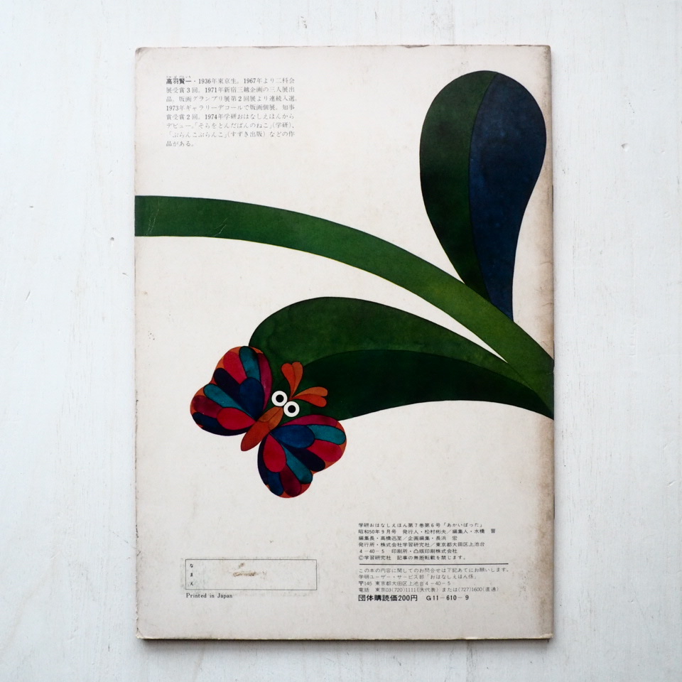 高羽賢一「あかいばった」*学研おはなしえほん [07484] 高羽賢一「あかいばった」*学研おはなしえほん [07484] 販売価格: 1,200円(税込) Tweet お問い合わせ 著者 : 高羽賢一(作)出版社 : 学習研究社発行年 : 1975/9/1 初版本の寸法 : 28.5 x 20.8 x 0.3 cm 送料区分 : A本の状態 : A〜B■絶版(版元品切れ、重版未定)です。■学研おはなしえほん・ソフトカバーです。■表紙の薄いスレ/薄いシワ、小口の小さな凹み/スレあり。 詳細画像