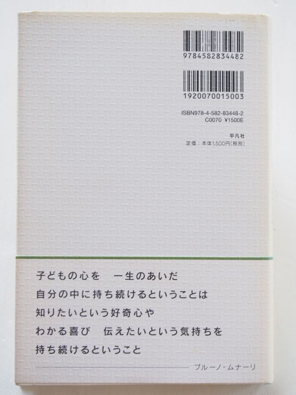 ブルーノ・ムナーリ「ムナーリのことば」 [03970] ブルーノ・ムナーリ「ムナーリのことば」 [03970] 販売価格: 700円(税込) Tweet 数量: 1 お問い合わせ 著者 : ブルーノ・ムナーリ(著) 阿部雅世(訳)出版社 : 平凡社発行年 : 2009/8/3 初版第1刷本の寸法 : 19 x 13.6 x 1.2 cm 送料区分 : A本の状態 : A■数々の著作や寄稿文の中から本人が選び編集した短文集です。■帯付き。カバーの薄いヤケ/小さな薄いヨゴレあり。 詳細画像 こちらもおすすめです 「ブルーノ・ムナーリ しごとに関係ある人 出入りおことわり」 [3969] ブルーノ・ムナーリ「やになった」 [3602] ブルーノ・ムナーリ「たんじょうびのおくりもの」 [3601] ブルーノ・ムナーリ「どうぶつうります」 [3600] ブルーノ・ムナーリ「THE CIRCUS IN THE MIST」 [3525] 松谷みよ子/中谷千代子「ちいさいモモちゃん モモちゃんのおくりもの」 [5906] ブルーノ・ムナーリ「Bruno Munari's ZOO」 [3222]