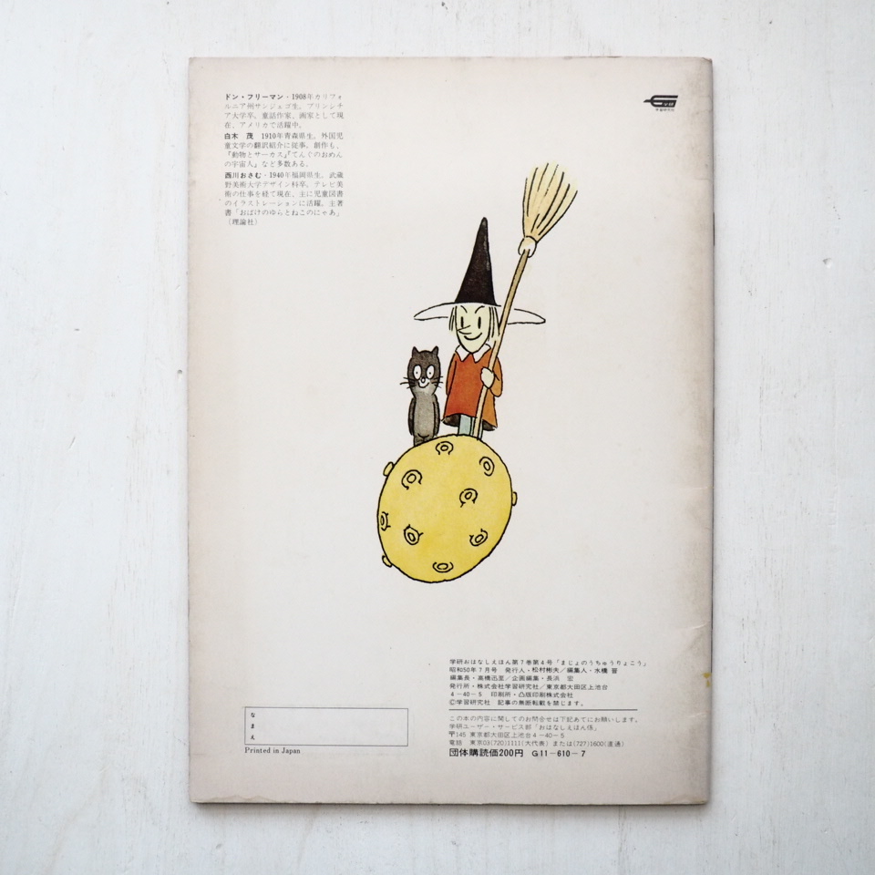 ドン・フリーマン/白木茂/西川おさむ「まじょのうちゅうりょこう」*学研おはなしえほん [07466] ドン・フリーマン/白木茂/西川おさむ「まじょのうちゅうりょこう」*学研おはなしえほん [07466] 販売価格: 1,000円(税込) Tweet お問い合わせ 著者 : ドンフリーマン(作) 白木茂(訳) 西川おさむ(絵)出版社 : 学習研究社発行年 : 1975/7/1 初版本の寸法 : 28.5 x 20.8 x 0.3 cm 送料区分 : A本の状態 : B■絶版(版元品切れ、重版未定)です。■学研おはなしえほん・ソフトカバーです。■表紙の薄いスレ/薄いヤケ、小口のすり切れあり。 詳細画像 こちらもおすすめです H・ウィルソン/小林与志他「きえたはーばーとくん」*学研おはなしえほん [07465] 1,000円(税込) 高羽賢一「そらをとんだぱんのねこ」*学研おはなしえほん [07464] 1,500円(税込)
